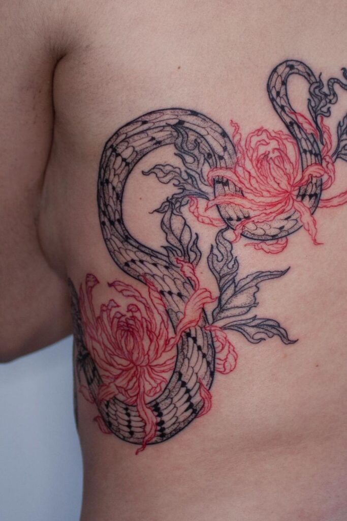 This unique chest tattoo combines the graceful curves of a serpent with the delicate beauty of chrysanthemums.