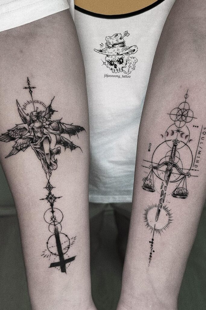 A classic choice is the libra scale tattoo, done in a geometric or realistic style, representing fairness and balance in a striking way.