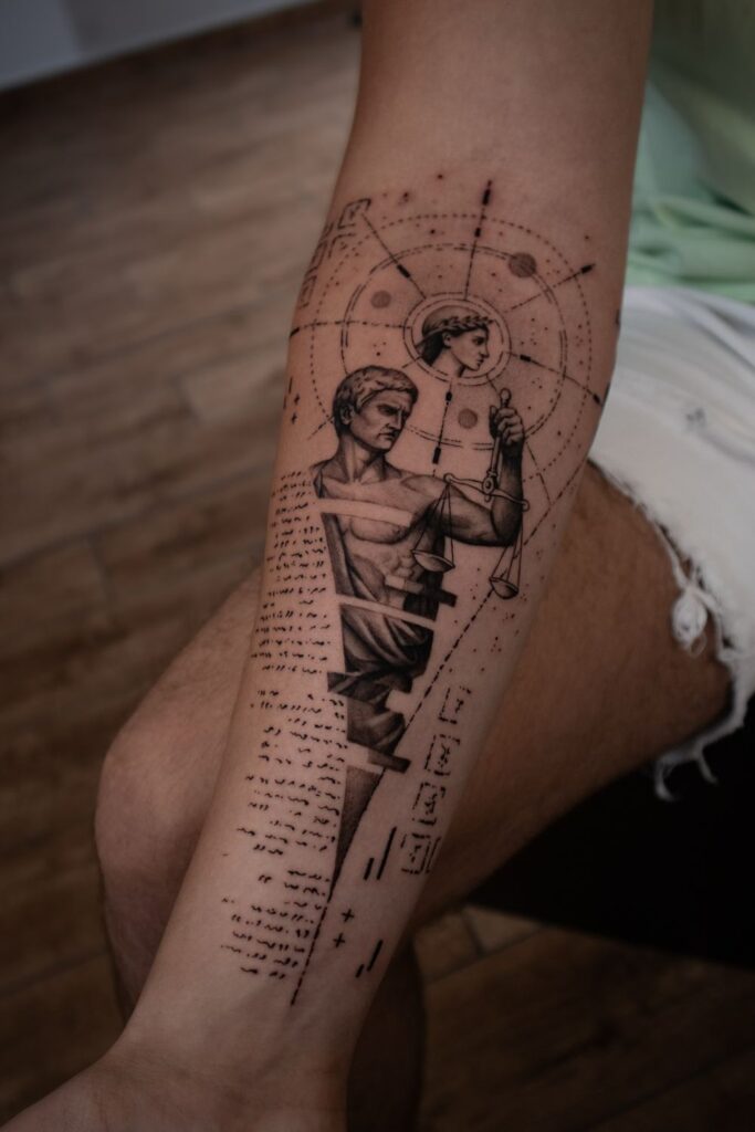 Some men choose a detailed libra goddess tattoo, reimagined as a warrior figure, while others go for a clean libra constellation tattoo across the shoulder or chest for a more subtle nod to their sign.