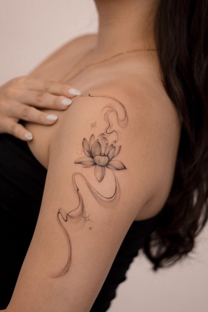 A lotus shoulder tattoo flows gracefully along the shoulder’s natural curve, making it a favorite for medium-sized and intricate designs.