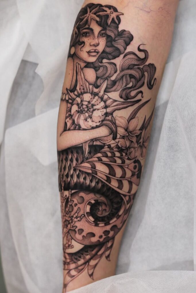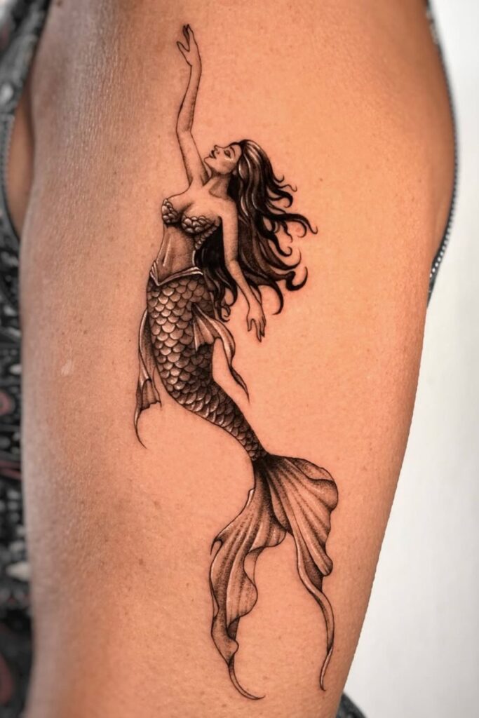 Black-and-grey mermaid pieces with detailed shading and moody underwater elements are powerful choices for anyone who wants a tattoo that feels bold, emotional, and unforgettable.