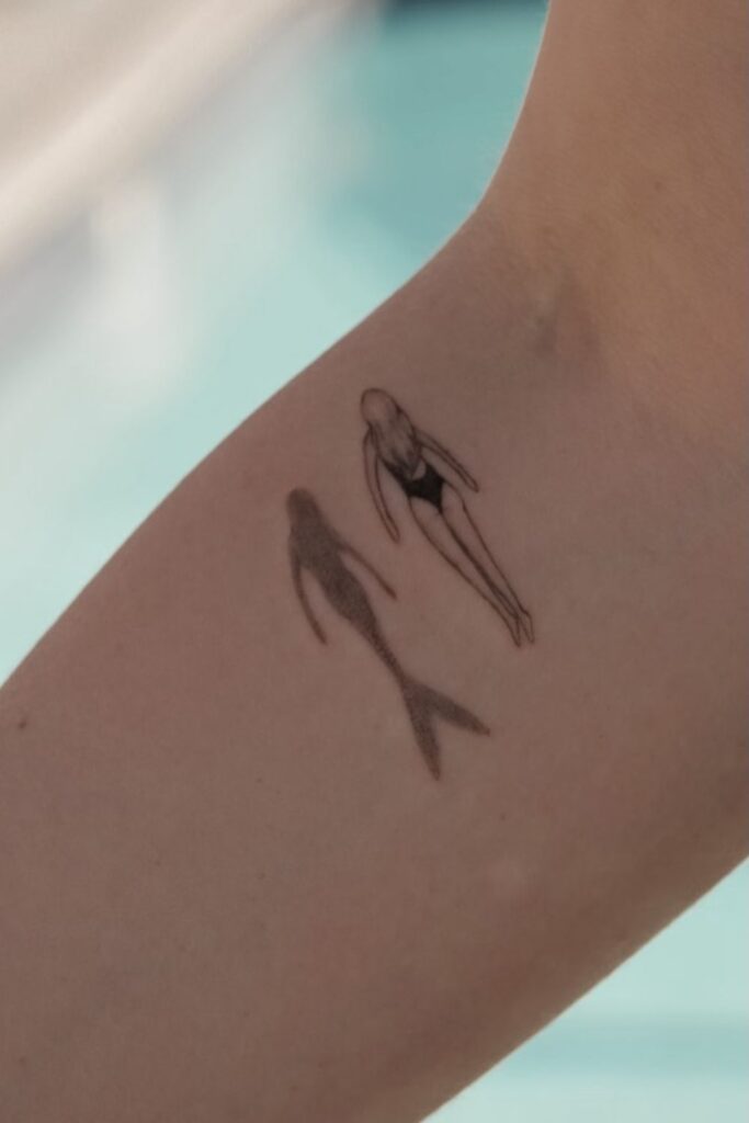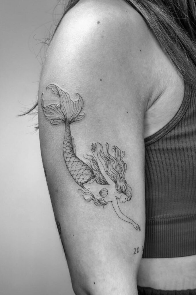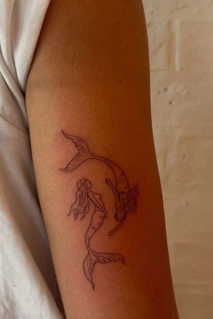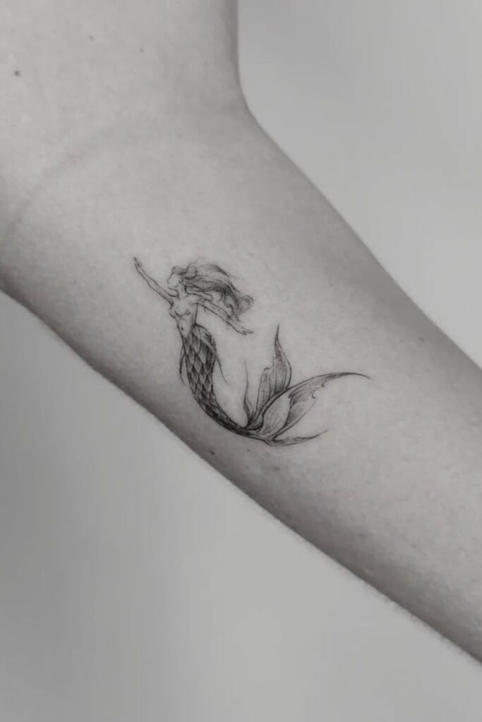 Minimalist mermaid tattoos often use fine line outlines and simple silhouettes, creating a soft and timeless look.