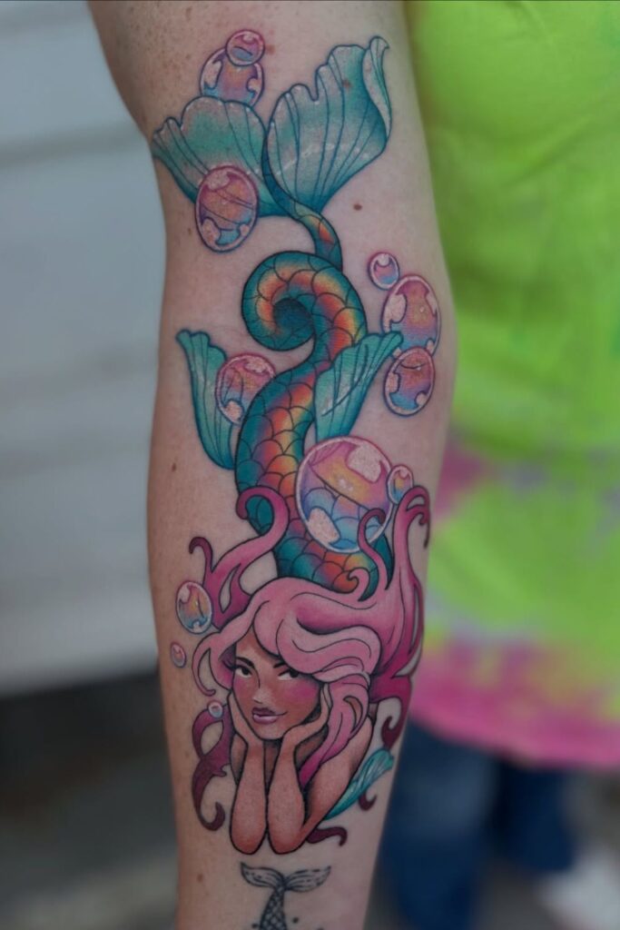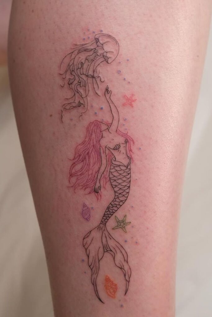 These tattoos are perfect if you want your mermaid tattoo to feel light, magical, and full of personality.