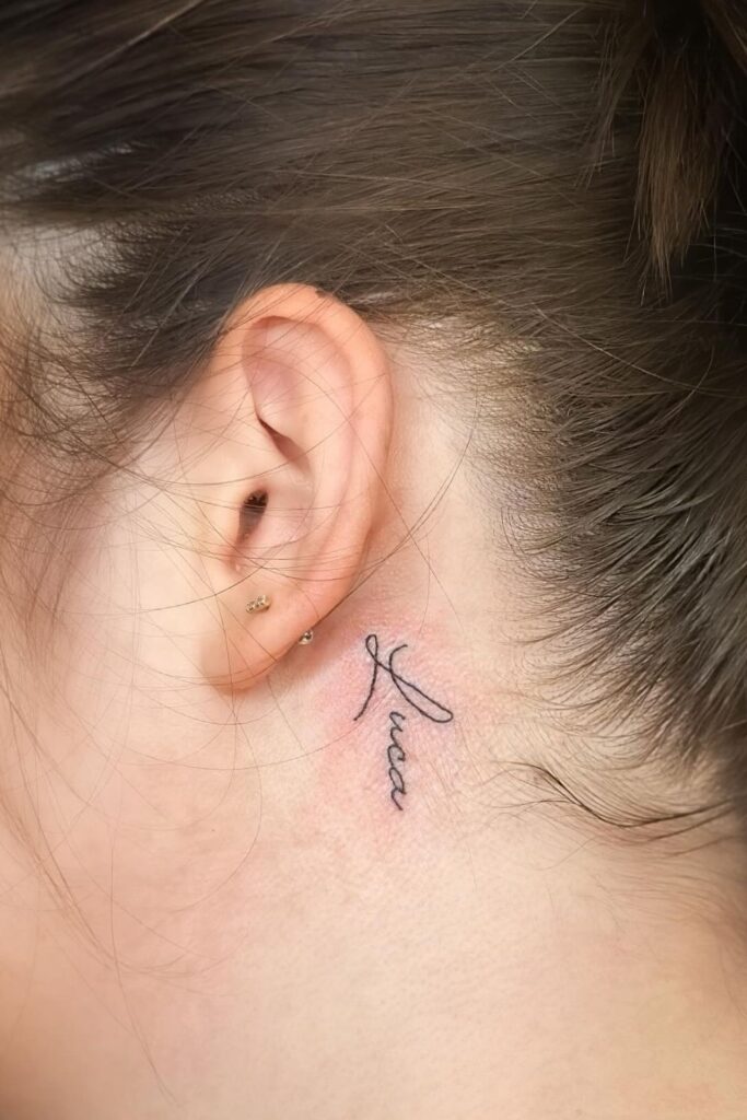 For example, a wrist tattoo is easy to show off but hard to hide, while a hidden name tattoo idea like behind the ear or on the ribcage is more discreet.