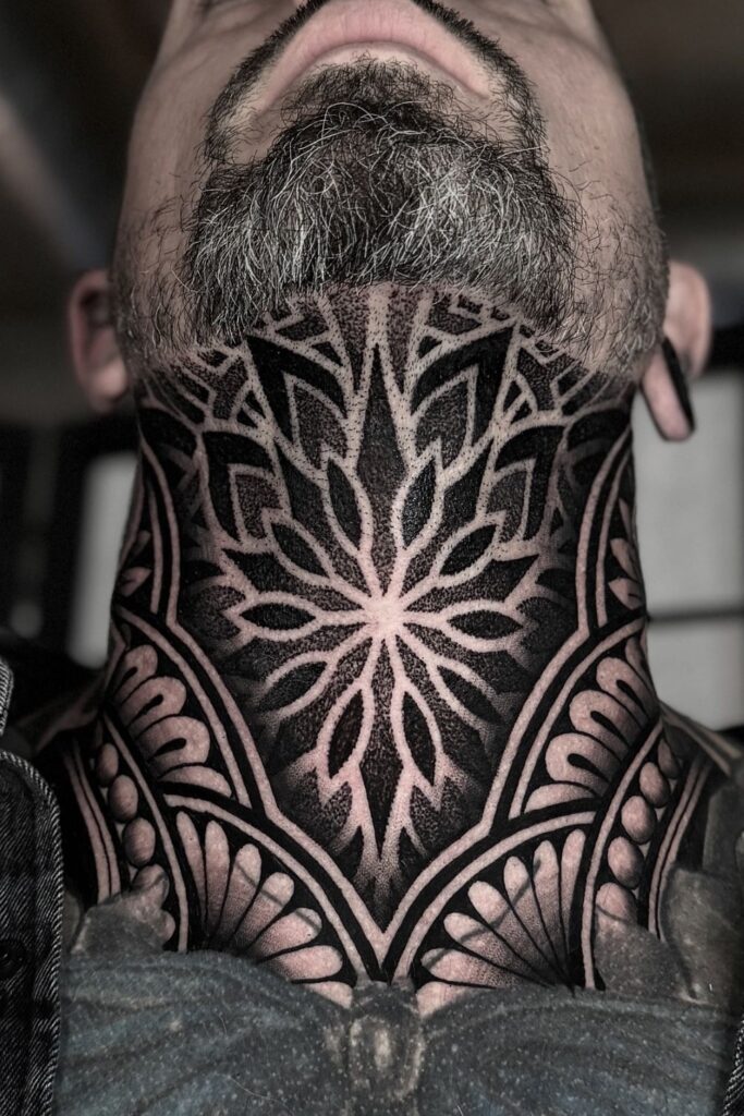 Placed on the front of the neck, this ornamental floral design merges bold blackwork with delicate dotwork for a unique and commanding presence.