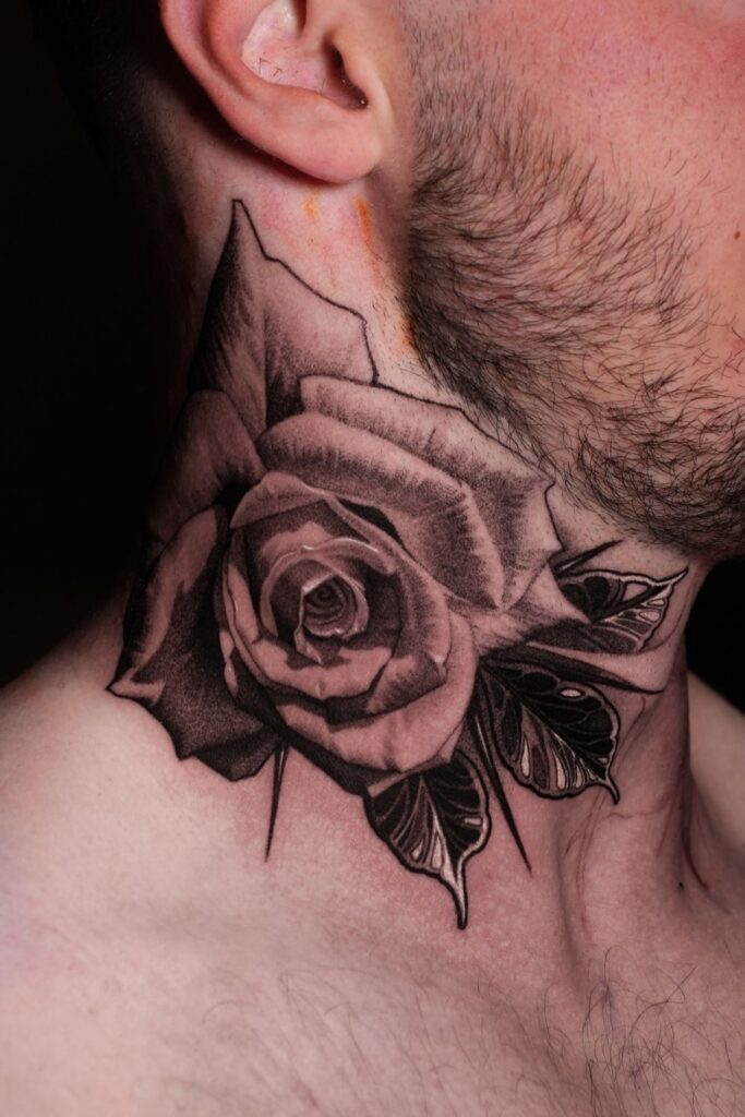 A classic side neck placement featuring a realistic black and grey rose that symbolizes strength, passion, and resilience.