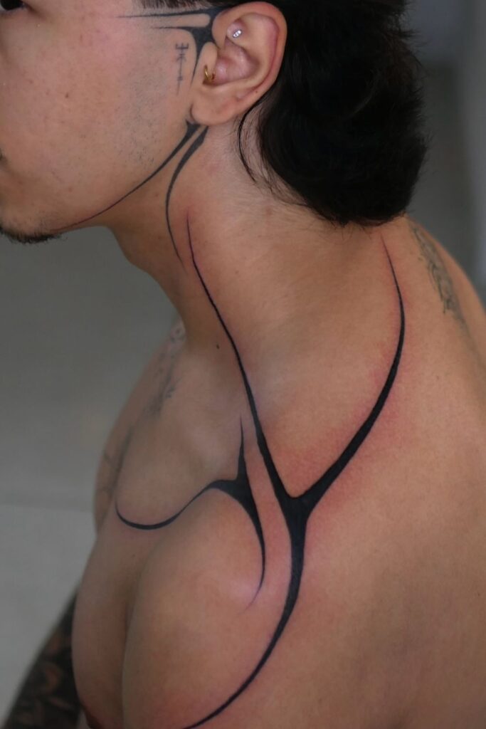 Wrapping from the side of the neck to the chest, this bold and artistic linework design creates an elegant yet edgy look.