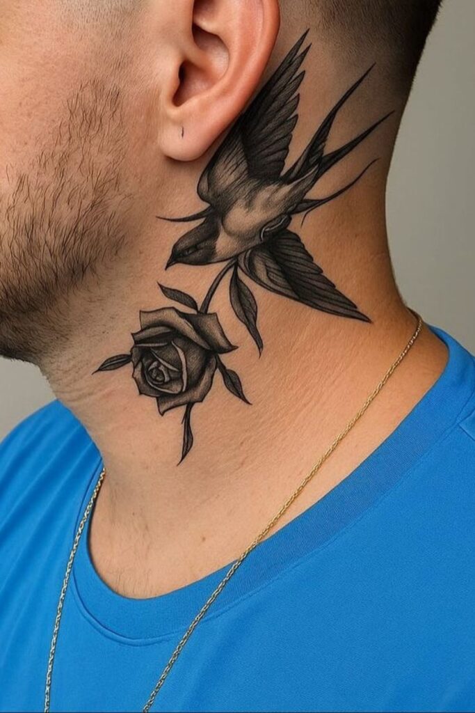 A rose combined with a bird creates a classic and elegant design placed on the side of the neck.