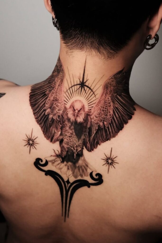 This powerful eagle piece sits on the back of the neck, radiating bold and detailed artistry.