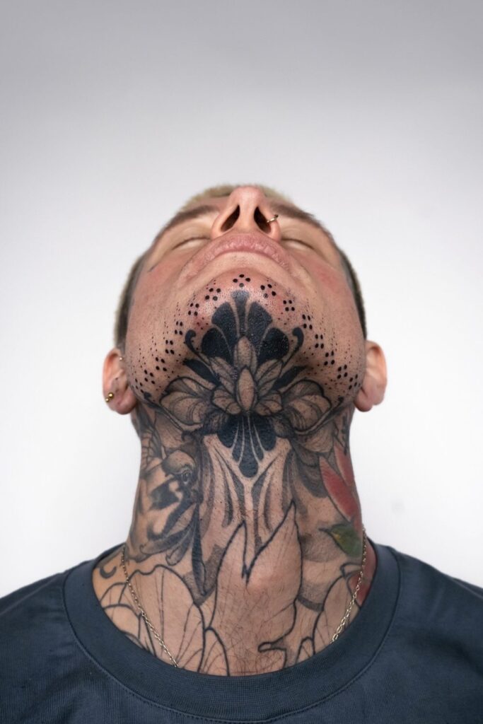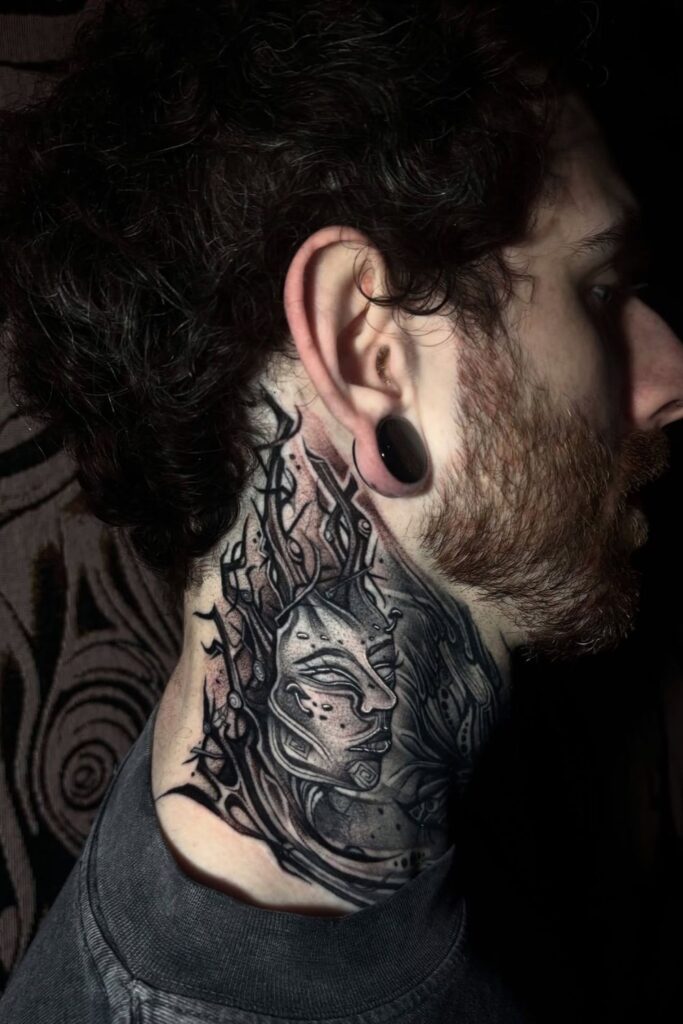 A great example of full neck tattoos that carry deep meaning and a bold aesthetic.