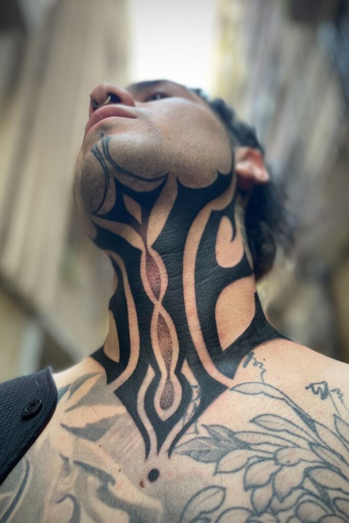 A full neck tattoo with bold tribal lines wrapping the throat, this piece radiates strength and identity.