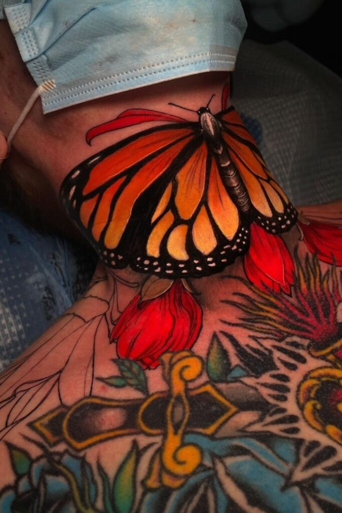Placed at the front and side of the neck, this bright and bold butterfly design symbolizes transformation and freedom.