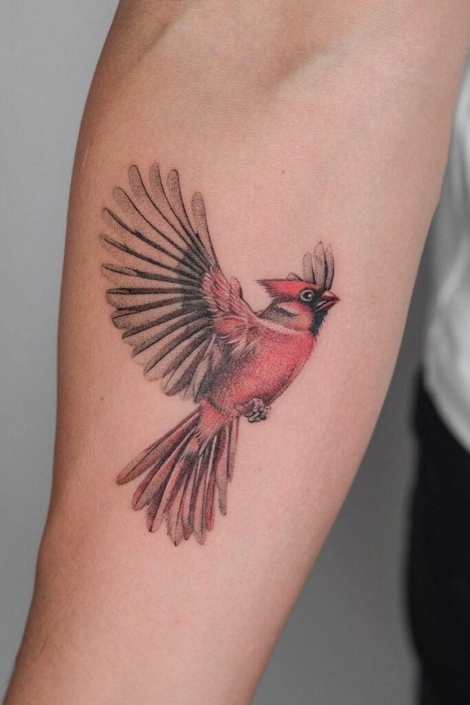 A flying cardinal tattoo often represents freedom, transformation, or the idea of the soul moving forward.