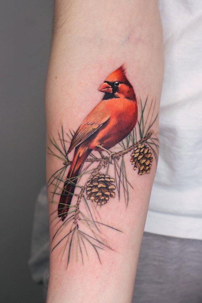 A mini cardinal tattoo is especially popular for placements like the inner arm, behind the ear, or along the ribcage.