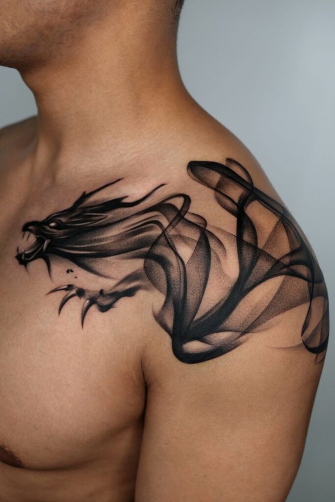 Bold and mesmerizing, this tattoo by tattooist_mate features a black ink dragon design that curls across the front and top of the shoulder, created with smoky, shadow-like strokes.