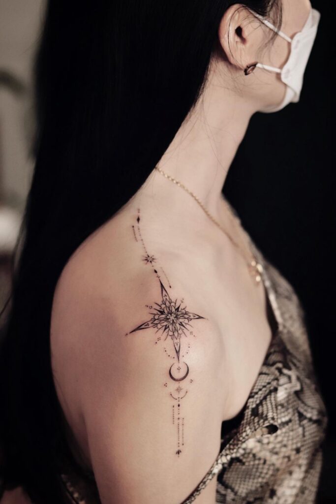 This gorgeous shoulder tattoo design by sukza__art features a compass rose, crescent moons, and intricate celestial details flowing gently over the shoulder and slightly down the arm.