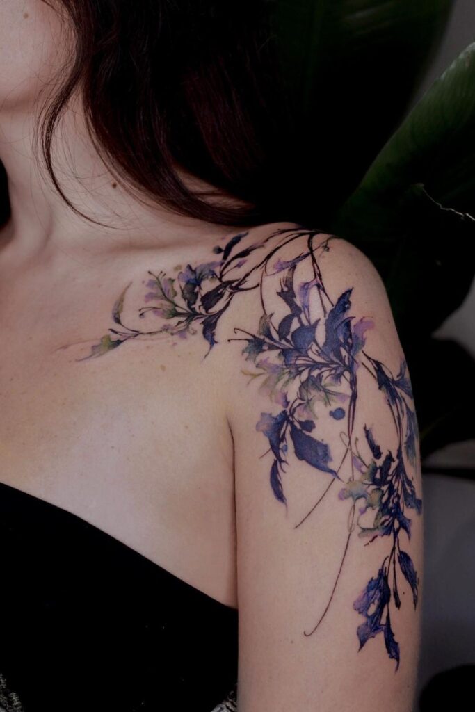 This dreamy tattoo by hongcha_tt uses shades of indigo, violet, and soft green to create a watercolor-inspired floral design that sweeps gracefully across the shoulder and upper arm.