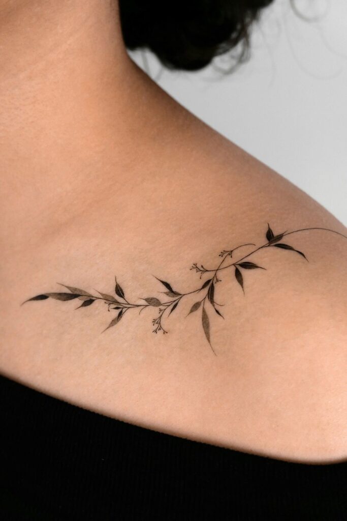 Simple and serene, this fine-line botanical design by tattooist_kam4 curves gently across the collarbone area, giving off an effortlessly elegant vibe.