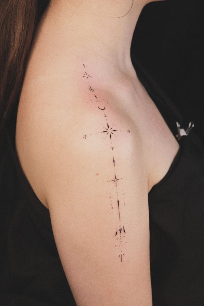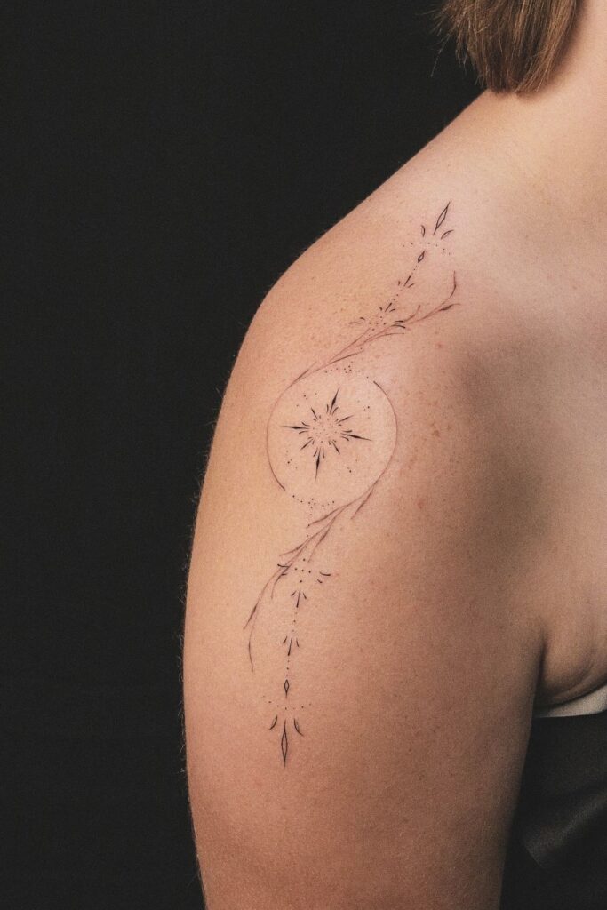 The placement highlights the shoulder cap perfectly, making it feel like the universe is resting on your skin.