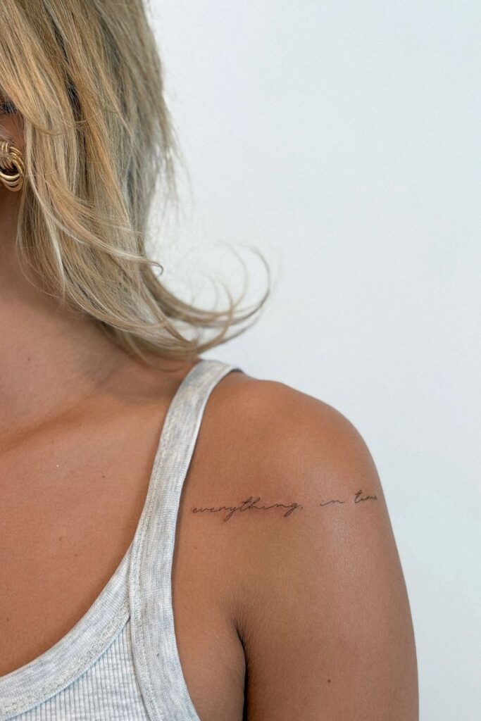 Subtle yet profound, this top of shoulder script tattoo by lexibkip features the handwritten phrase “everything in time.”