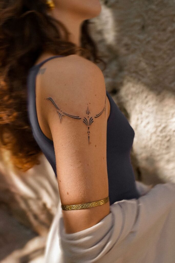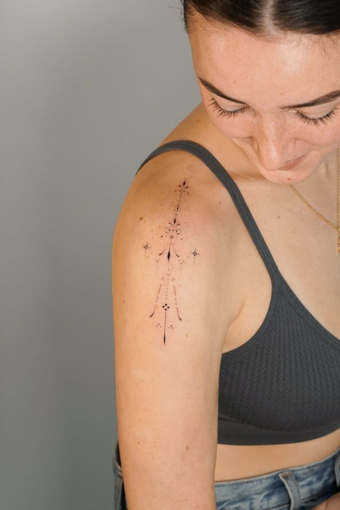 It’s a beautiful example of a dainty top of shoulder tattoo, ideal for those who prefer subtle yet unique body art.