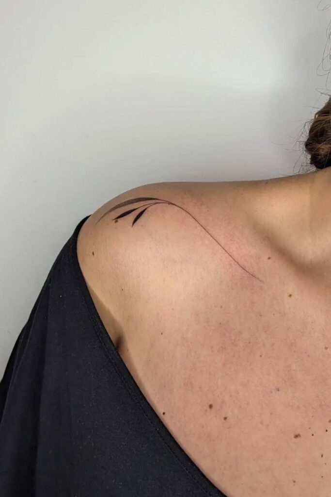 Minimalism at its finest, this delicate brushstroke tattoo by mella_fabe follows the curve of the top shoulder, appearing like a breeze or a single blade of grass.