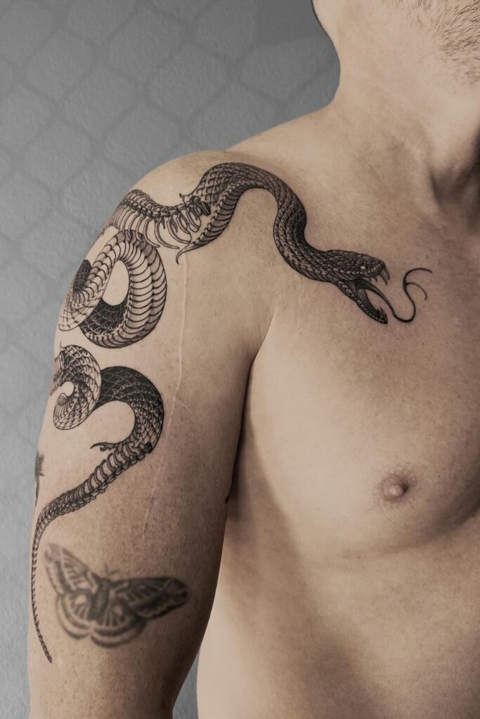 Coiled across the shoulder and extending toward the chest, this snake tattoo by uncogrim