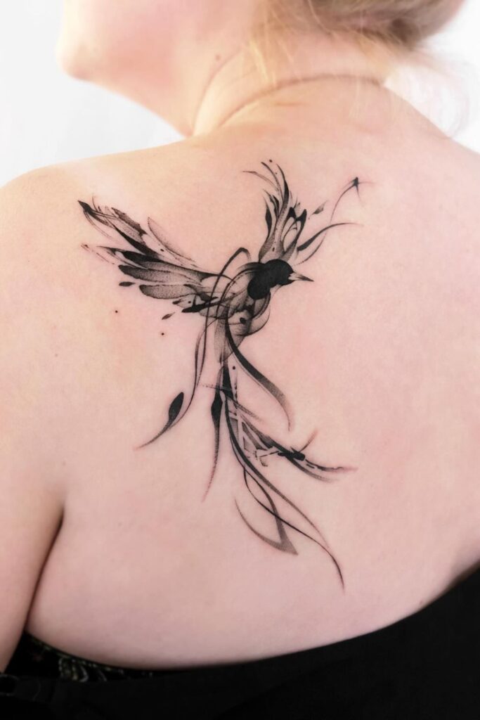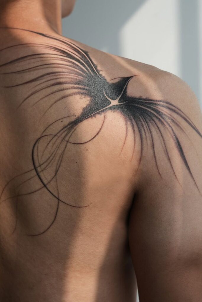This stunning abstract shoulder tattoo by tattooist.pado features a bird-like silhouette exploding into flowing lines, sweeping across the upper back and shoulder blade.