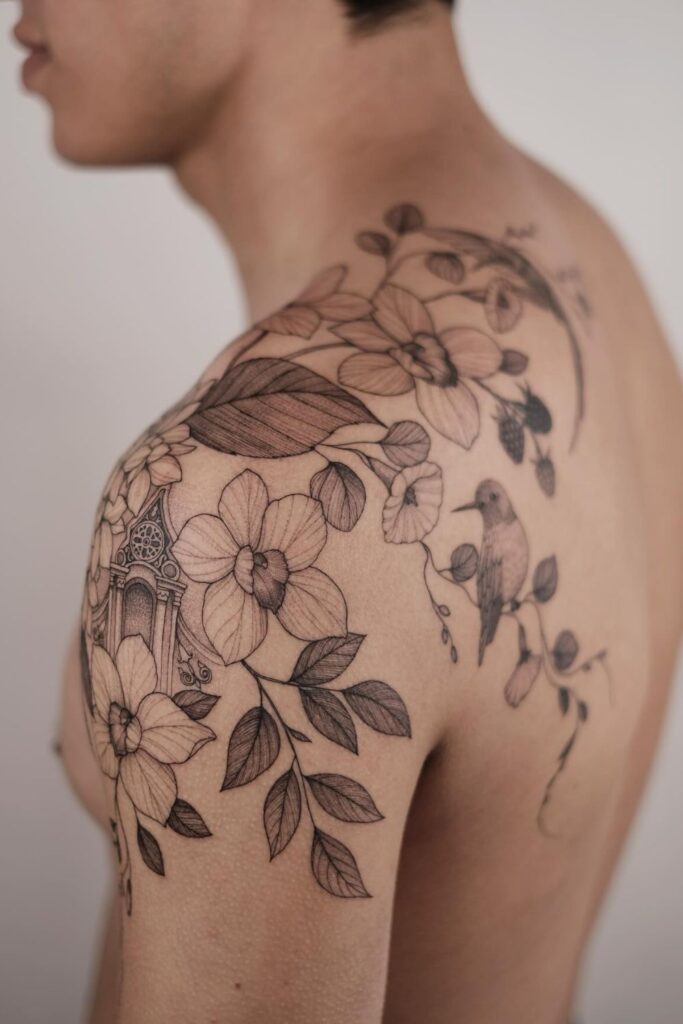 Delicate florals, detailed leaves, and a perched bird weave across the shoulder and upper arm in this intricate, monochromatic design by aestet.ink.