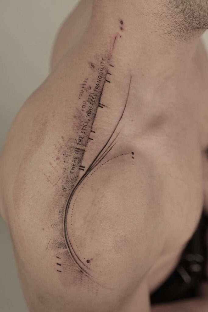 The placement is discreet but powerful, ideal for someone who appreciates abstract expression and wants a shoulder tattoo that feels light, graceful, and personal.