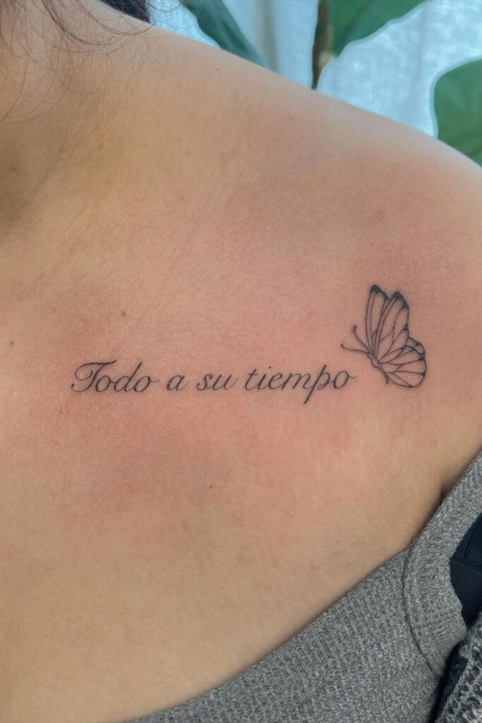 Beautiful in its simplicity, this elegant tattoo by gracedoestattoos features a delicate butterfly and the Spanish phrase “Todo a su tiempo,” meaning “Everything in its time.”