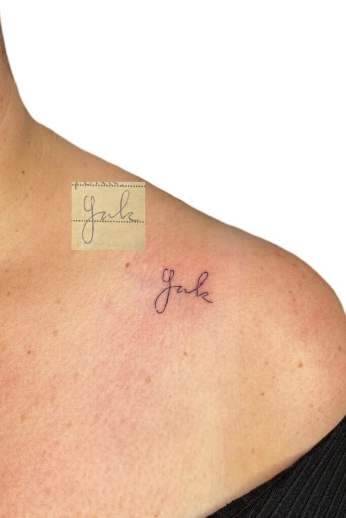 This delicate tattoo by lorentattoos captures a loved one’s handwriting, inked beautifully on the upper shoulder.