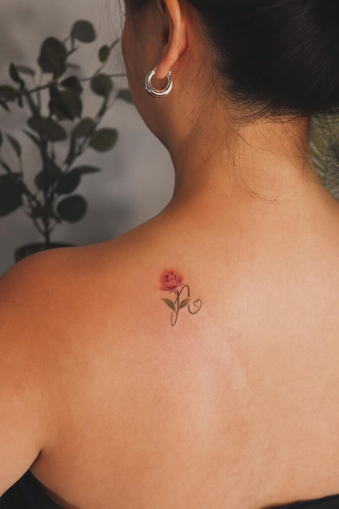 Delicate yet rich in meaning, this tattoo by noul_tattoo showcases a finely detailed rose and script initial placed on the back of the shoulder.