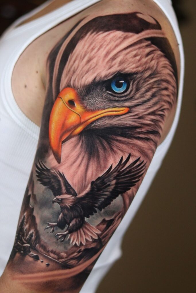 This full-color masterpiece by doouglastattoo dominates the shoulder and upper arm, blending hyperrealistic eagles with vibrant, piercing eyes and dynamic scenery.