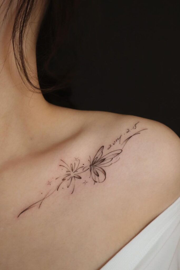 Whimsical and elegant, this design by mendyyyy.tattoo features a butterfly, floral accents, and delicate script flowing across the top of the shoulder and collarbone.
