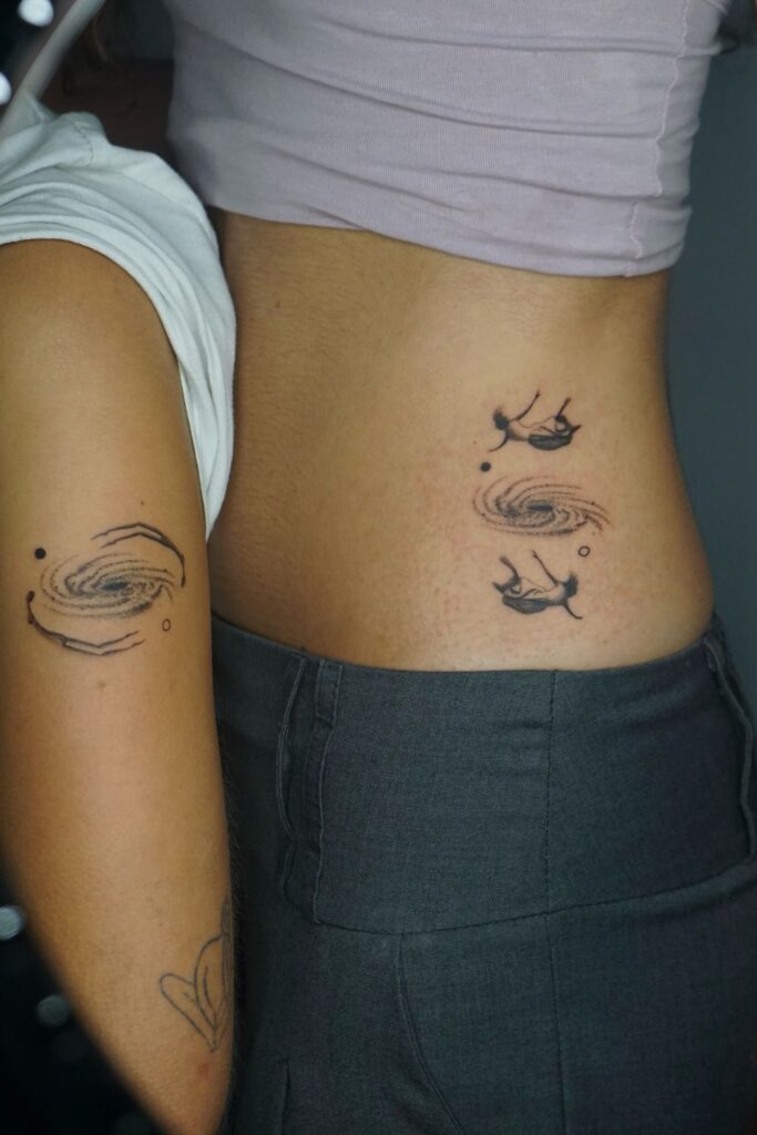 Galaxy-inspired ink celebrates a bond as endless as the stars, and the playful line art of two figures captures the closeness between siblings in a sweet, simple way.