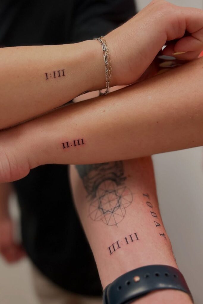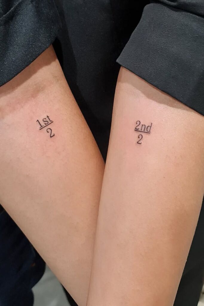 Numbers, order tattoos (1st of 2, 2nd of 2), or special times make the design personal. You can also keep it cute with flowers or words like forever.