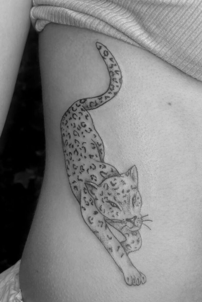 Tigers and big cats are popular choices for strong, elongated rib cage tattoos for women, emphasizing confidence and independence.