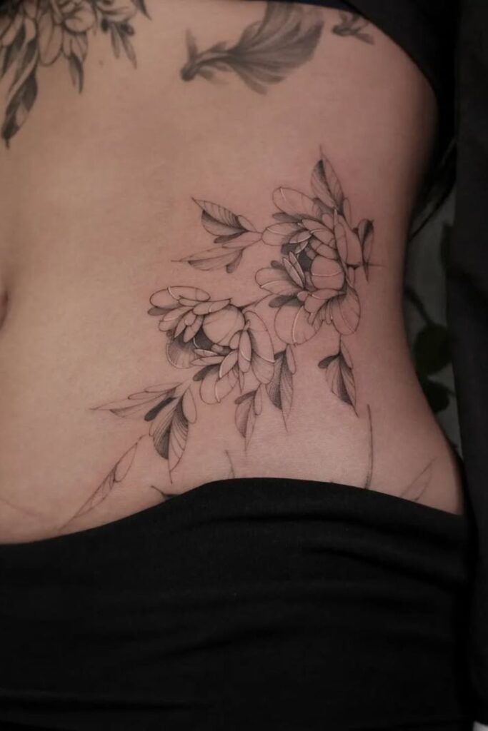 Flowers naturally follow curves, making them perfect for a tattoo on side of stomach placement.