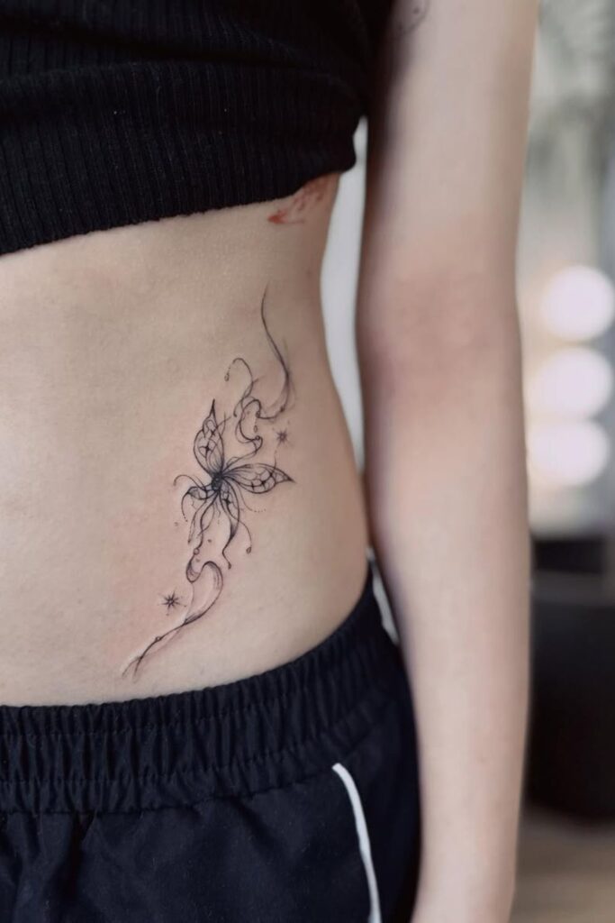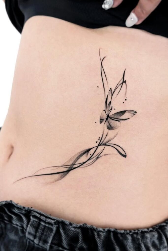Butterflies are a powerful choice for stomach tats for women, especially in side placements.