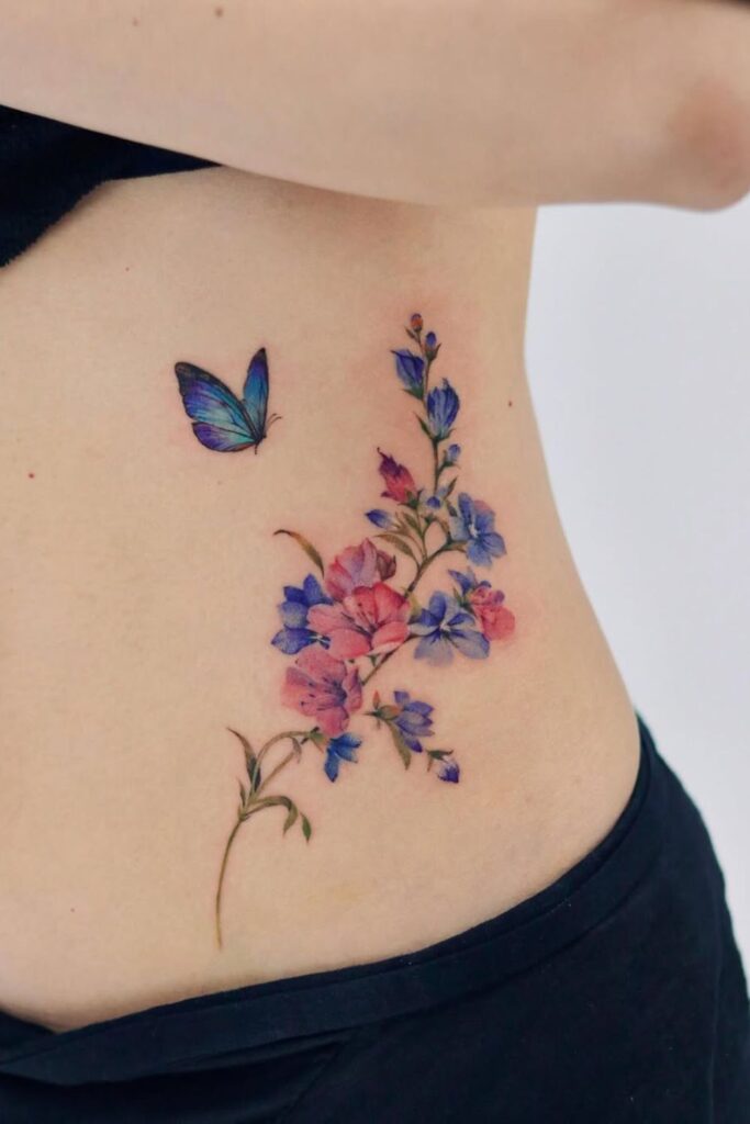 Symbolizing transformation, growth, and rebirth, butterfly designs make a meaningful woman side tattoo while maintaining a light and graceful aesthetic.