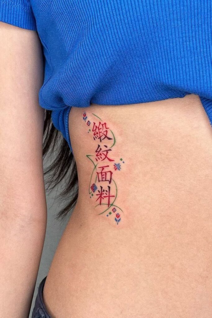 This is one of the most timeless choices for rib tattoos for women. The design starts beneath the bust and flows downward along the ribs.