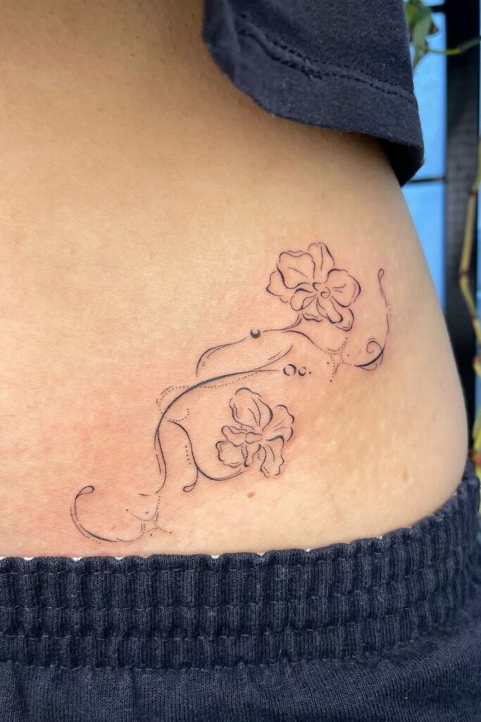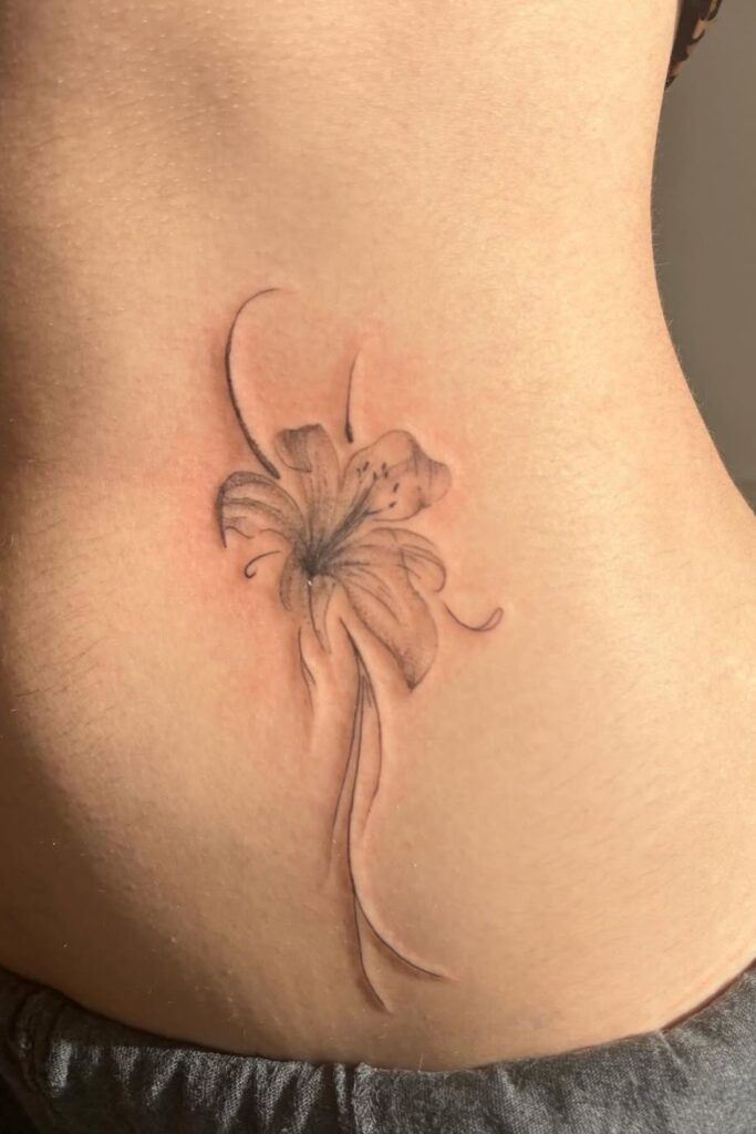 Larger blooms can also wrap gently into a side of hip tattoo, enhancing the waistline and adding softness to the silhouette.