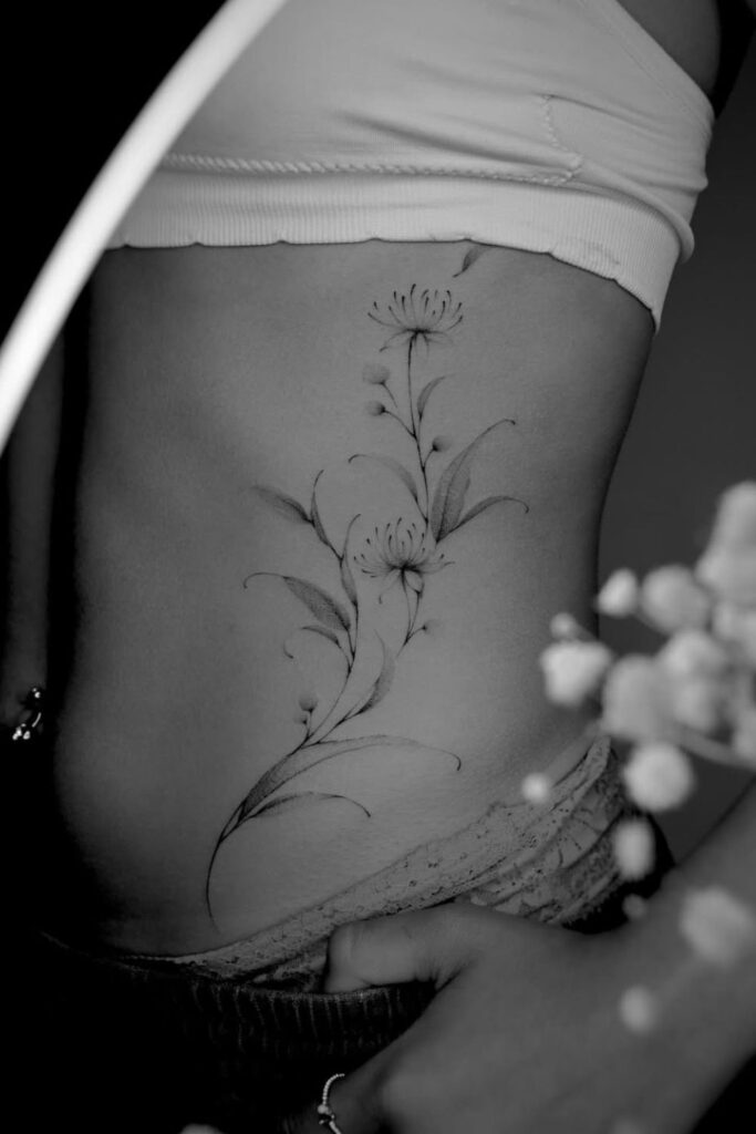 A vertical stem running along the ribs can create the illusion of length, which is why many women choose florals as elegant rib tattoos for women.