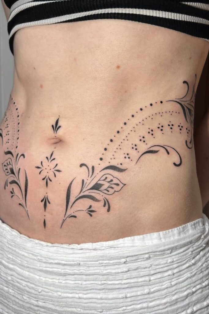 These styles work beautifully as a tattoo on side of stomach that stretches toward the waist or hip.