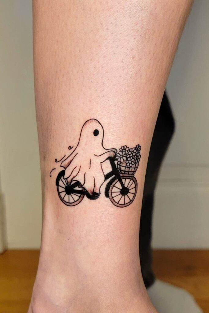 Perfect for adventurers, cyclists, and free spirits who want a ghost mini tattoo that tells a story.