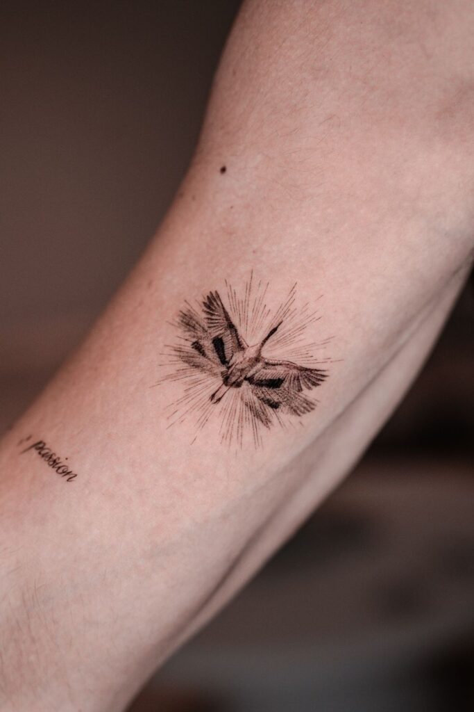 Combined with the word “passion,” it’s a perfect minimalist tattoo men design for dreamers, artists, or anyone who leads with their heart.
