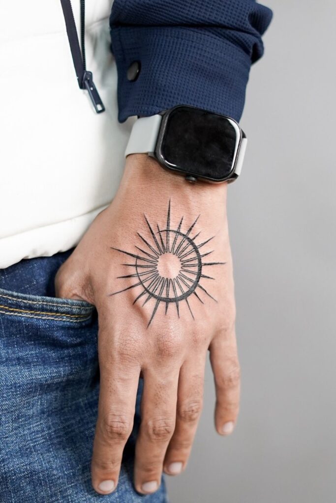 This geometric sunburst design placed boldly on the hand radiates energy, power, and vitality.