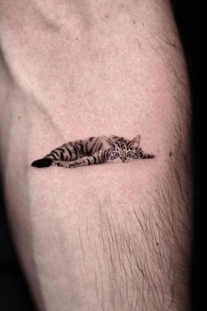 This ultra-detailed cat tattoo captures the peaceful yet alert gaze of a tabby at rest. It symbolizes quiet observation, independence, and the comfort of familiarity.