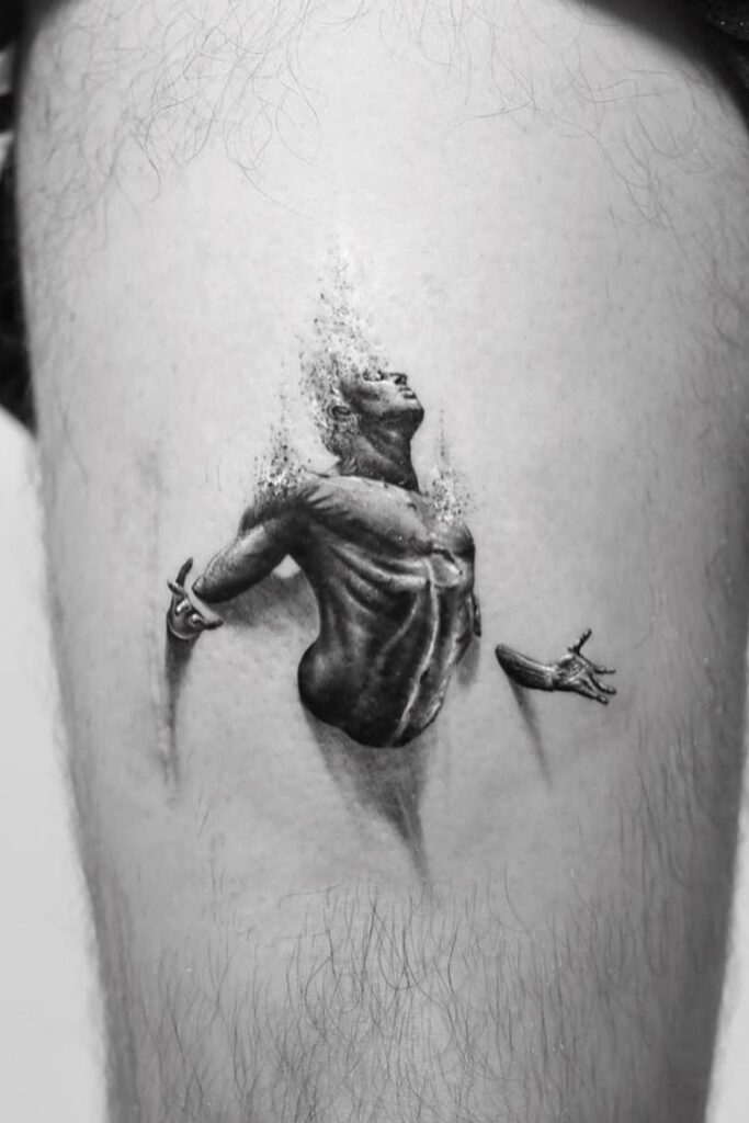 This powerful tattoo shows a man emerging and dissolving at once, an intense visual metaphor for transformation, rebirth, or the emotional breaking point that leads to healing.
